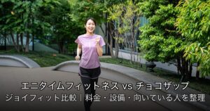 エニタイムフィットネスの月額7,000〜10,000円程度という料金帯は、チョコザップ(3,278円程度)より高いですが、設備の充実度・シャワー・フリーウェイトなどを考慮すると、本格的なトレーニング用途では妥当なコストといえる場合もあります。ジョイフィット24(5,000〜8,000円程度)と比べると若干高めですが、グローバルな店舗ネットワークを活用できる点がエニタイムならではの強みです。RIZAPのような完全パーソナルジムと比べると圧倒的にリーズナブルで、自分で継続できる方向けの選択肢として優れています。